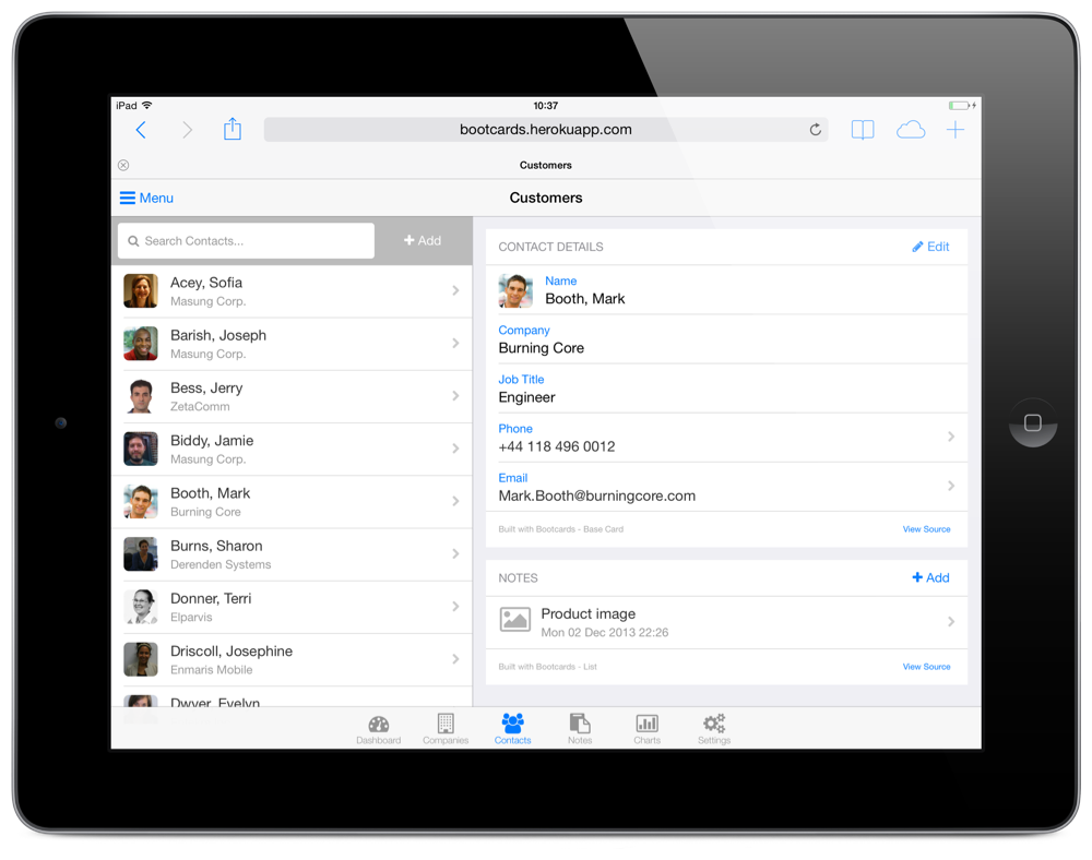 The demo app is a simple CRM application with companies, customers and notes. It was built using NodeJS and is hosted on Heroku. Note that not all functions in the demo app have been implemented.